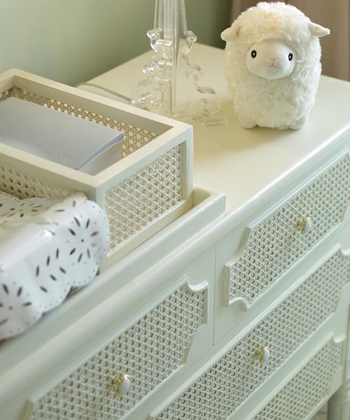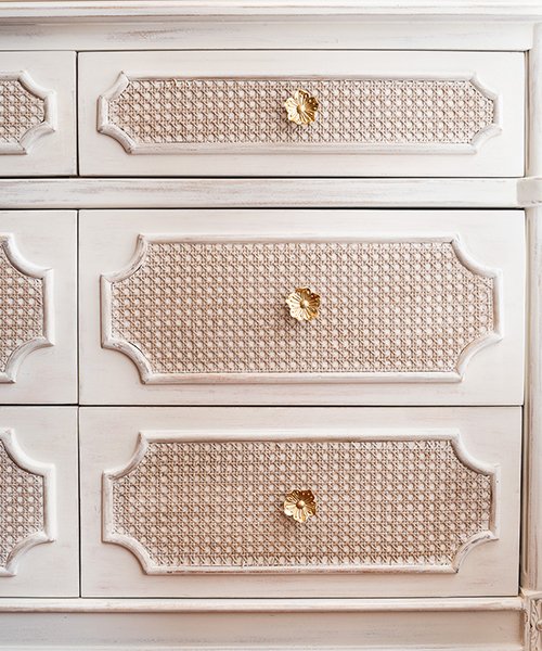 Un diseño clasico y delicado, frente de gavetas en esterilla natural circular, curvas en su remarco y toque tallado en patas.