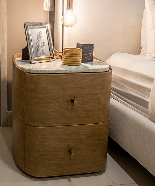 Nochero que combina elegancia con funcionalidad, estructura en madera y su cubierta en marmol
