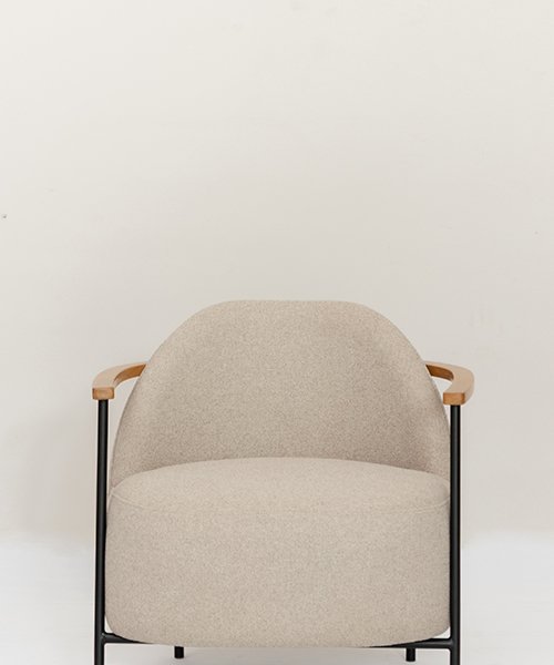 Tapizado, estructura en hierro y brazos en madera de roble